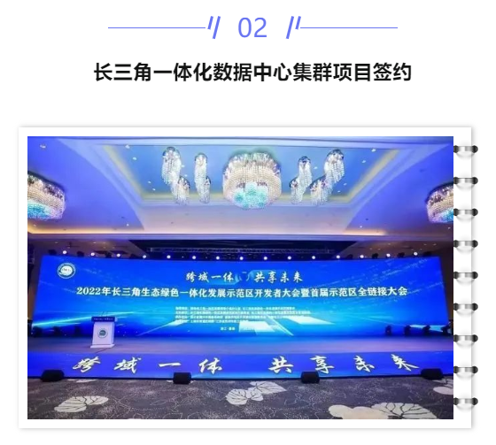 7月13日,长三角生态绿色一体化发展示范区举办展示范区开发者大会。大会举行重点合作项目签约仪式,分别为:共建长三角一体化数据中心集群项目(签约方:示范区执委会、两区一县政府、中国电信、中国移动、优刻得、阿里巴巴)、共建长三角国家技术创新中心项目(签约方:示范区执委会、两区一县政府、长三角国家技术创新中心)、金融赋能示范区高质量发展战略合作项目(两区一县政府、金融同城化服务与创新联盟)。