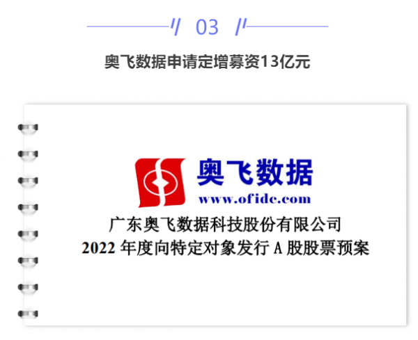 近日,奥飞数据发布公告,申请定增募集资金,本次发行股票募集资金总额(含发行费用)不超过人民币13亿元,扣除发行费用后,将用于:1)新一代云计算和人工智能产业园(廊坊固安B栋和C栋)项目,拟投入5.7亿元;2)数字智慧产业园(广州南沙A栋)项目,拟投入3.7亿元;3)补充流动资金及偿还银行贷款,3.6亿元。本次募集资金拟投资项目建成后,奥飞数据将在北京和广州周边地区分别新增 3,200 个和 1,460 个机柜,获得更多的客户订单,满足客户的需求,提升公司的市场份额和行业地位。