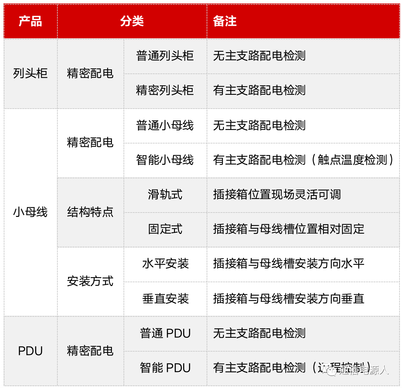 属于历史最久,应用时间最长的末端配电设备,也是目前最为成熟的终端配电产品,产品偏定制化,当前技术发展主要是配合部分高端客户需求,类似支路温度检测、开关热插拔支持调相等(请关注公众号:通信电源人)。