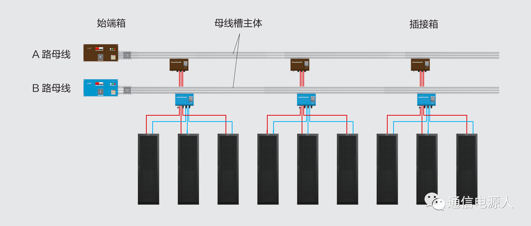 A/B路2N配置(蓝 /棕),每条母线既给本列机柜供电,也需通过横向桥架跨天窗给对列机柜供电(请关注公众号:通信电源人)。